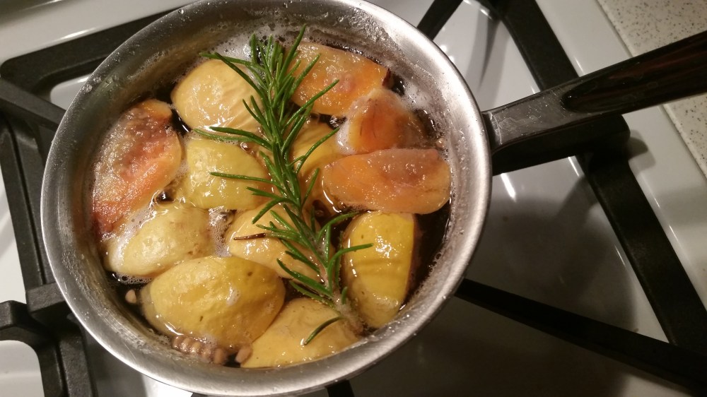 I ask my sister-in-law what they are. She thinks loquats, but she’s not sure. I grab three ripe ones, wash them and cut them into quarters. I make a simple syrup with 1 cup each of water and sugar, add the fruit, bring it to a boil, then reduce it to a simmer. It smells like something that would pair well with rosemary, so I trim a 3-inch-long sprig off the hedge that lines the side of the house and drop it into the pan.
