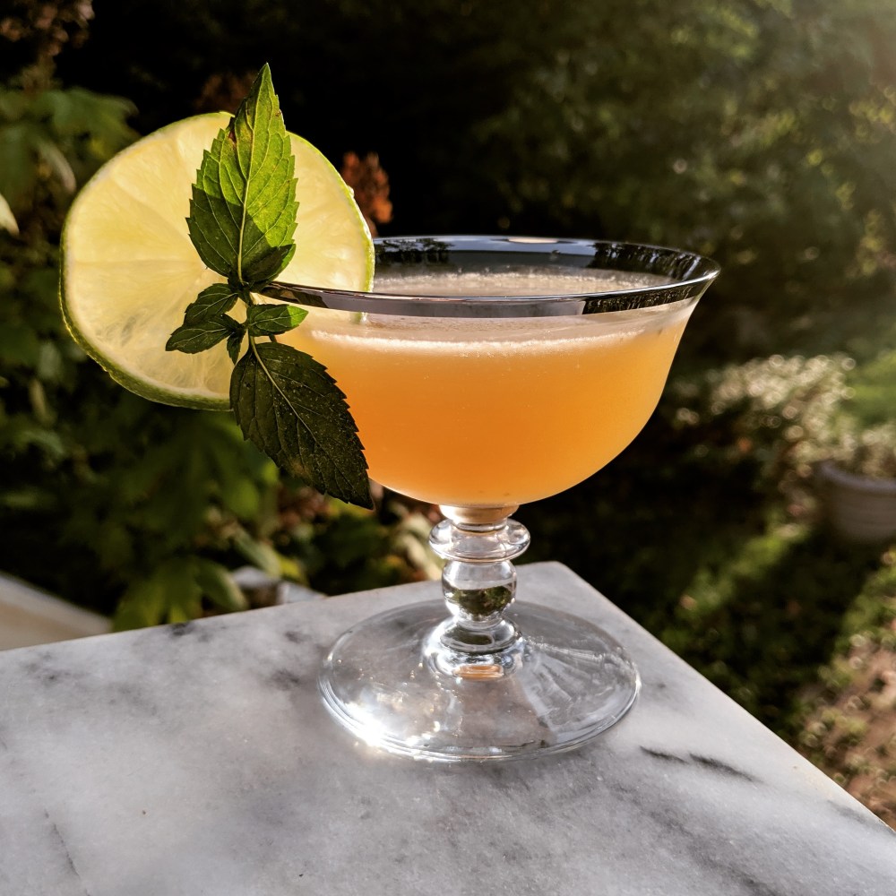 Savoring my waning mint plant, I grab six big leaves, wash them, smack them, then lightly muddle them in the bottom of my shaker. I add 1 ounce of Nauti Spirits Rum and an ounce of Blackwell Jamaican Rum to inject a little funk. To tiki it up a bit, I add a 3/4 ounce of Maggie’s Farm Falernum Liqueur, a clove-forward, rum-based falernum with ginger and lime. Finally, I add 3/4 ounce of lime juice and, for a smoother mouthfeel, 3/4 teaspoon of gum syrup. I add ice, shake, then double-strain into a chilled coupe garnished with a lime wheel and mint sprig.